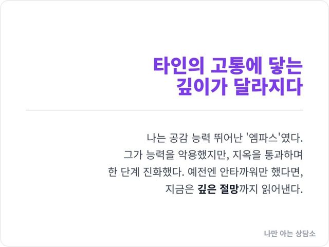 예전의 당신이 타인의 슬픔을 그저 ‘안타까워하는’ 수준이었다면, 지금의 당신은 타인의 고통을 ‘해석하고 통찰하는’ 수준에 도달했다. 누군가 “나 너무 힘들어”라고 말할 때, 당신은 그 말의 껍데기가 아닌 그 이면의 깊은 절망, 훼손된 존엄, 말로 표현 못 할 수치심까지 읽어낸다.