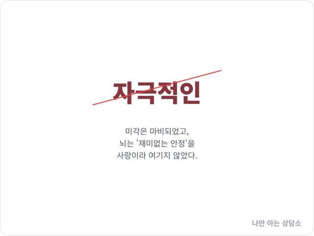 이 ‘지루함’이야말로 당신의 뇌가 보내는 가장 건강한 신호임에도 불구하고, 자극적인 도파민에 절여진 당신의 뇌는 그것을 ‘사랑이 아니다’라고 오판하고 밀어낸다. 마치 캡사이신 범벅인 음식만 먹다가 슴슴한 평양냉면을 먹었을 때 “아무 맛도 안 나잖아”라고 투덜거리는 것과 같다.