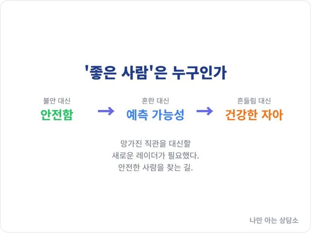 우리는 이 미각을 되살려야 한다. ‘좋은 사람’이란 단순히 착해 빠진 사람을 의미하지 않는다. 여기서 말하는 좋은 사람은 ‘안전한 사람(Safe Person)’, ‘예측 가능한 사람’, 그리고 ‘자아(Ego)가 건강한 사람’이다.