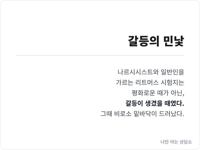 나르시시스트와 일반인을 가르는 가장 선명한 리트머스 시험지는 평화로운 때가 아니라, 갈등이 생겼을 때다. 싸울 때 그 사람의 밑바닥이 드러나기 때문이다.