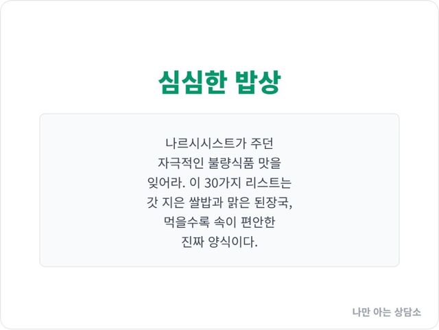 나르시시스트가 제공했던 그 화려하고 자극적인 ‘불량 식품’ 맛을 기억에서 지워라. 그 맛은 당신의 내장을 파괴했다. 이 30가지 리스트에 부합하는 사람은, 갓 지은 쌀밥과 맑은 된장국 같은 사람이다. 처음에는 심심하게 느껴질지 몰라도, 먹을수록 속이 편안하고, 당신의 몸과 마음을 단단하게 살찌우는 진짜 양식이다.