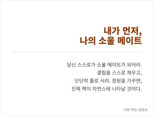 하지만 그전에 선행되어야 할 과제가 있다. 당신이 먼저 당신 자신의 소울 메이트가 되어야 한다. 자신의 감정을 읽어주고, 자신의 결핍을 스스로 채우며, 혼자 있는 시간을 즐길 줄 아는 단단한 사람이 되어야 한다.