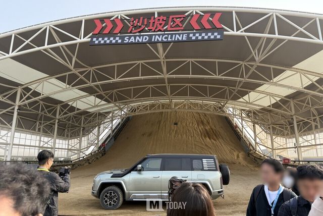 서킷의 속도감을 뒤로하고 향한 곳은 기네스 세계 기록을 보유한 모래 경사로 구역이다. 내몽골 사막에서 가져온 모래 6,200톤을 채워 만든 이 코스는 총 길이 90m, 최대 경사도 28도, 수직 낙차 29.6m에 달한다. 언덕 아래에서 올려다보면 "어떤 오프로더가 이런 곳을 오를 수 있을까?" 궁금증을 자아낼 정도의 각도다.