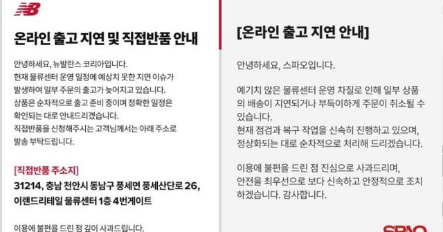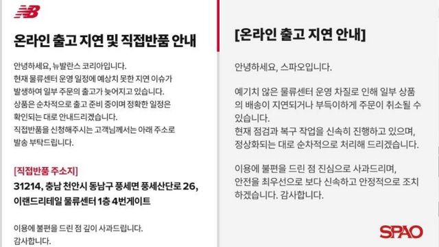 이랜드가 운영하는 대부분 브랜드에서 비슷한 상황이 벌어지고 있다. 전국 매장에는 겨울 신상 대부분이 이미 출고된 상태라 오프라인 매장은 정상 운영이 가능하지만, 온라인 발송분은 차질이 불가피하다. 회사는 뉴발란스, 스파오, 후아유 등 자사 패션 브랜드 홈페이지 곳곳에 배송 지연 공지를 게시했다.