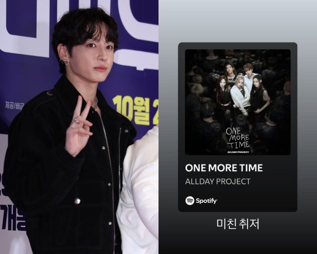 정국은 18일 자신의 소셜미디어(SNS) 계정에 올데이 프로젝트의 신곡 ‘원 모어 타임’(ONE MORE TIME) 음원을 공유하며 “미친 취저(취향 저격)”란 글을 남겼다.