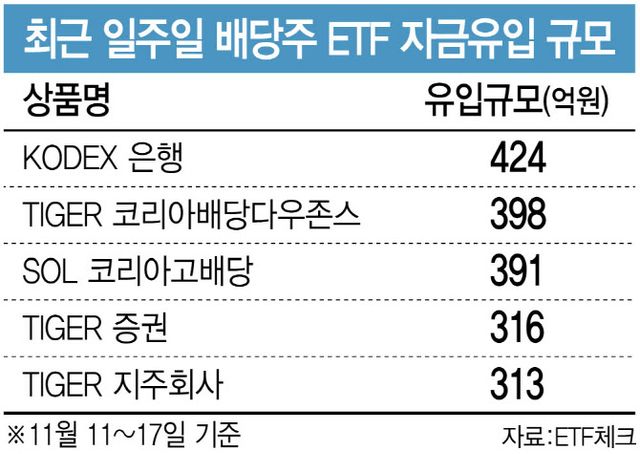 코스콤 ETF체크에 따르면 최근 일주일간 ‘KODEX 은행’ 상장지수펀드(ETF)에는 424억원이 몰려 전체 ETF 자금유입 26위에 올랐다. ‘TIGER 코리아배당다우존스’(398억원·30위), ‘SOL 코리아고배당’(391억원·32위), ‘TIGER 증권’(316억원·41위), ‘TIGER 지주회사’(313억원, 43위) 등에도 자금이 대거 유입됐다.