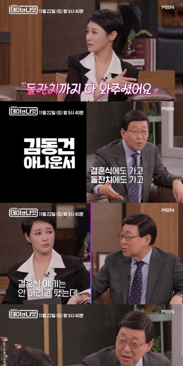 김주하는 김동건에 대해 "제가 결혼하고 아이를 낳았는데, 돌잔치까지 다 와주신 분"이라며 고마움을 전했다. 이에 김동건이 "결혼식에도 갔고 돌잔치에도 갔다"고 하자, 김주하는 "결혼식 이야기는 안 하려고 했는데…"라며 귀여운 투정을 부렸다.