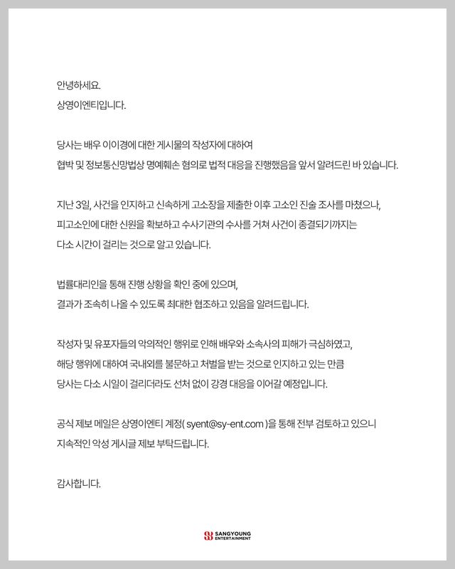소속사 상영이엔티 측은 19일 공식입장을 통해 "당사는 배우 이이경에 대한 게시물의 작성자에 대하여 협박 및 정보통신망법상 명예훼손 혐의로 법적 대응을 진행했음을 앞서 알려드린 바 있다. 지난 3일, 사건을 인지하고 신속하게 고소장을 제출한 이후 고소인 진술 조사를 마쳤으나, 피고소인에 대한 신원을 확보하고 수사기관의 수사를 거쳐 사건이 종결되기까지는 다소 시간이 걸리는 것으로 알고 있다. 법률대리인을 통해 진행 상황을 확인 중에 있으며 결과가 조속히 나올 수 있도록 최대한 협조하고 있음을 알려드린다"고 밝혔다.