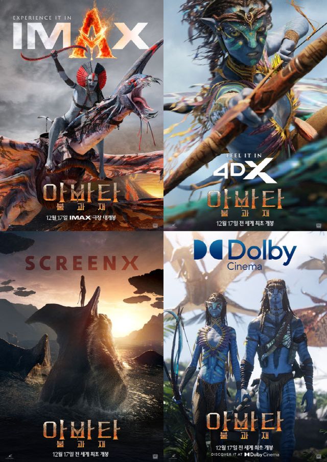 SCREENX 포스터 또한 오직 ‘아바타’ 시리즈에서만 만나볼 수 있는 압도적 경관을 담아내며 눈길을 사로잡는다. 거대한 툴쿤을 포함하여 다양한 크리처들이 세 개의 면에 걸쳐 그려지며 이들의 경이로운 여정을 극강의 몰입도로 담아낼 예정이다. 마지막으로 돌비 시네마 포스터에는 전장의 선두에 선 제이크 설리(샘 워싱턴 분)와 네이티리의 모습이 담겨 가슴을 웅장하게 한다. 돌비 시네마 포맷은 극강의 선명함과 압도적 사운드로 리얼리티를 더하며 완벽한 영화 관람을 제공할 것이다.