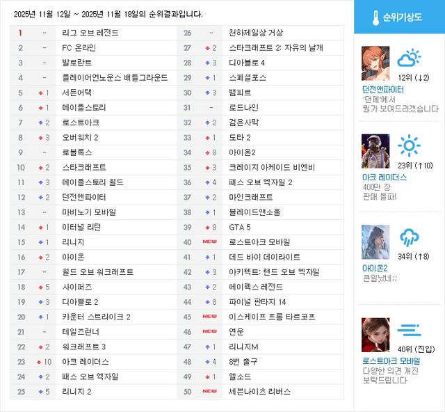 이번 주에 가장 큰 순위 상승을 이룬 게임은 아크 레이더스다. 지난주보다 10계단 상승해 22위에 자리했다. 아크 레이더스는 11월 중순에도 완연한 상승곡선을 타고 있다. 넥슨은 지난 11일 3분기 실적발표를 통해 PC와 콘솔을 합쳐 판매량 400만 장을 돌파했고, 동시 접속자 70만 명을 돌파했다고 밝힌 바 있다. 발매 전 배틀필드 6와 콜 오브 듀티: 블랙 옵스 7 사이에 출시되어 주목도가 떨어지리라는 우려도 있었으나, 뚜껑을 열어보니 이는 기우였다.