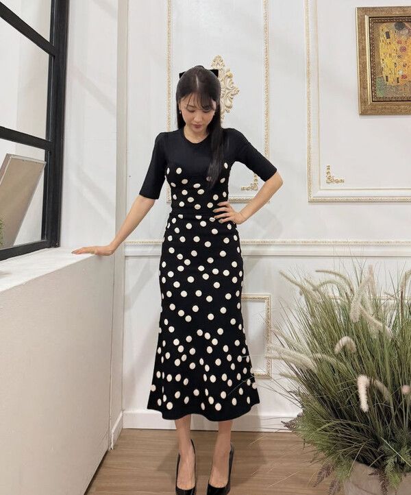 사진 속 박하선은 물방울 무늬 원피스를 입고 있다.