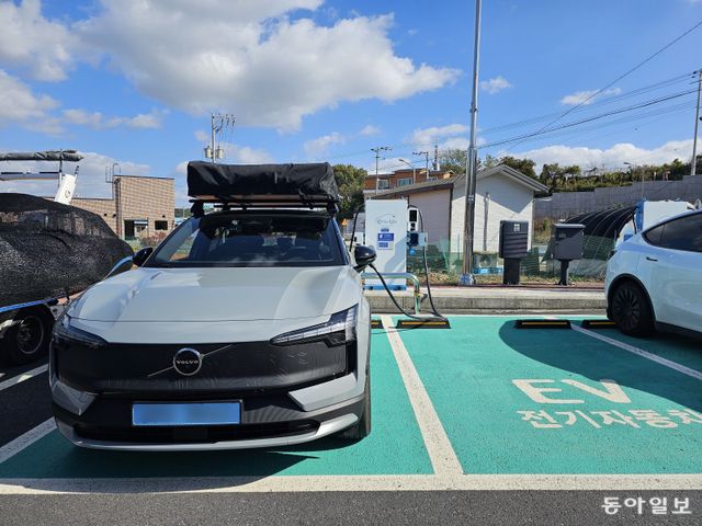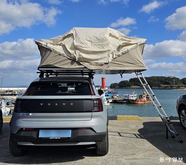 이달 초 충남 보령시의 한 바닷가에서 볼보 EX30 크로스컨트리 루프 텐트를 펼친 모습(위쪽 사진)과 급속 충전 중인 모습(아래 사진). 보령=김재형 기자 monami@donga.com