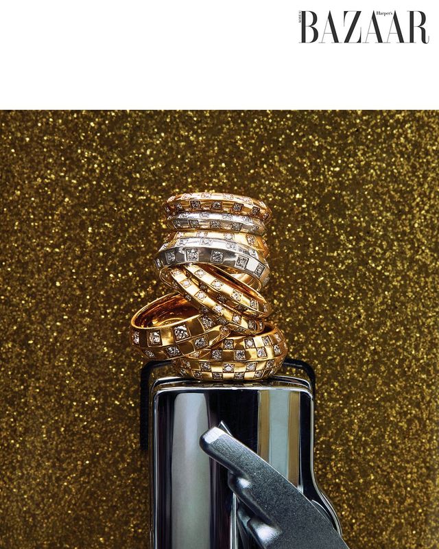 오른손 검지에 착용한 미디엄 사이즈 화이트 골드 링, 중지에 착용한 미디엄 사이즈 핑크 골드 링, 약지에 착용한 라지 사이즈 옐로 골드 링, 레이어드한 스몰 사이즈 핑크 골드 링, 왼손 검지에 착용한 라지 사이즈 화이트 골드 링, 중지에 착용한 미디엄 사이즈 옐로 골드 링, 약지에 착용한 미디엄 사이즈 핑크 골드 링, 레이어드한 스몰 사이즈 화이트·옐로 골드 링은 모두 다이아몬드 세팅의 ‘르 다미에 드 루이 비통’ 컬렉션 Louis Vuitton.
