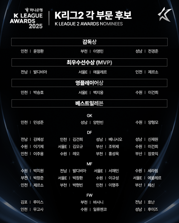 선정된 후보들은 24일부터 각 구단 감독(30%), 주장(30%), 미디어(40%) 투표를 통해 수상자를 가린다. K리그1·2 베스트11은 시상식 당일인 내달 1일 오전 사전 공개할 예정이며, MVP·영플레이어·감독상 수상자는 같은 날 오후 3시 서울 홍은동 스위스그랜드호텔에서 열리는 ‘하나은행 K리그 2025 대상 시상식’ 현장에서 발표된다.