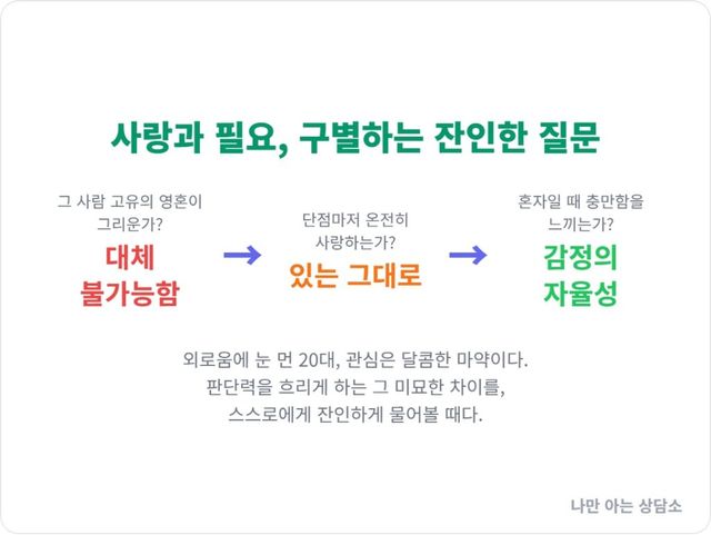 - - 진단: 후자라면, 당신은 그를 사랑하는 것이 아니라 그가 제공하는 ‘서비스’를 사랑하는 것이다. 그 자리에 그 남자가 아닌 다른 누군가(심지어 AI 챗봇이라도)가 앉아 있어도 상관없다면, 그것은 명백한 ‘필요’에 의한 연애다.
