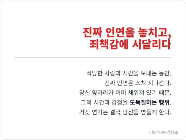 - - 진단: 사랑은 에너지를 채워준다. 하지만 외로움을 덮기 위한 연애는 감정 노동이다. 맞지 않는 옷을 억지로 입고 연극을 한 배우처럼, 데이트가 끝나면 녹초가 된다. 당신의 무의식은 이미 알고 있다. 이 만남이 가짜라는 것을.