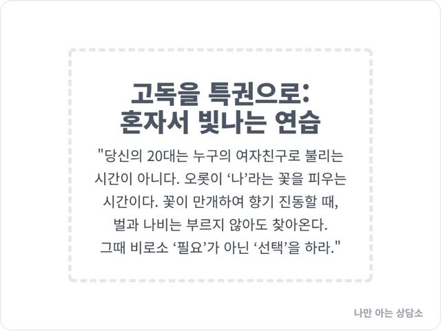 그러니 조급해하지 마라. 당신의 20대는 누군가의 여자친구로 불리기 위해 존재하는 시간이 아니다. 오롯이 ‘당신’이라는 꽃을 피우기 위한 시간이다. 그 꽃이 만개하여 향기가 진동할 때, 벌과 나비는 부르지 않아도 찾아온다. 그때 만나는 사람이, 진짜 당신의 인연이다.