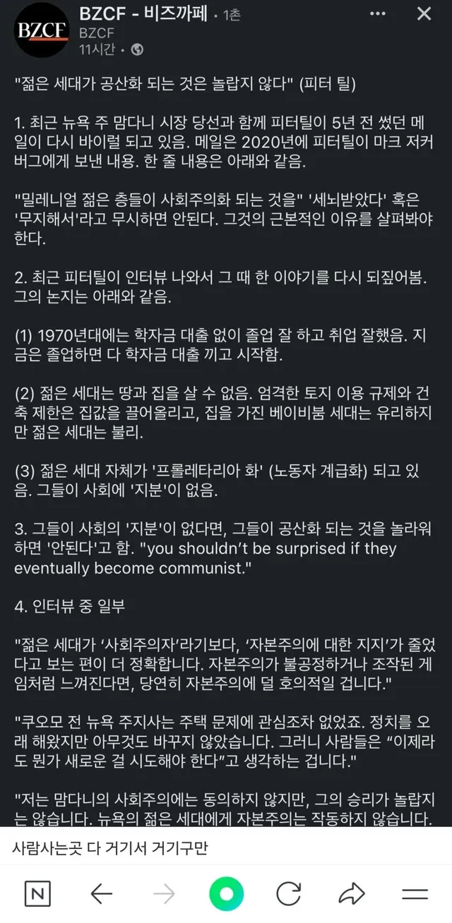 피터틸이 2020년 페이스북 임원들에게 보낸 이메일이 다시 회자되고 있는 이유다. "젊은 세대가 자본을 축적하지 못한다면, 그들은 자본주의에 이해관계를 잃게 될 것이다. 결국 그 체제에 등을 돌리게 된다."