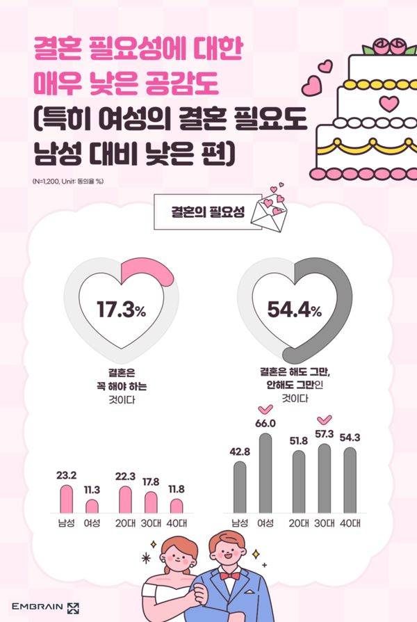 시장조사전문기업 엠브레인 트렌드모니터가 19~49세 미혼 남녀 1200명을 대상으로 조사한 결과 결혼은 필수라는 응답은 17.3%에 그쳤다. 반면 결혼을 선택으로 인식하는 응답은 절반을 넘었고 특히 여성과 40대에서 결혼의 필요성을 낮게 평가하는 비율이 뚜렷하게 높았다. 결혼 의향이 아예 없다는 응답은 여성 24.7%, 40대 27.5%로 다른 집단보다 높게 나타났다.