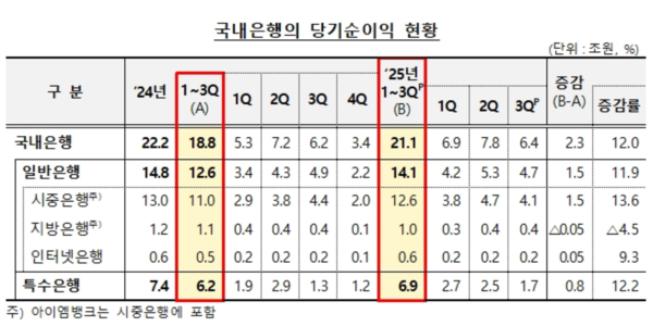 20일 금융감독원이 누적 21조 1000억원의 당기순이익을 기록하며 역대 최대치를 경신했다. 이는 전년 동기(18조 8000억원) 대비 2조 3000억원(12.0%) 증가한 수치로, 이미 지난해 연간 순이익 규모(22조 2000억원)에 육박한다.