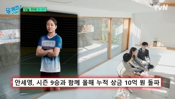 뉴시스 보도에 따르면, 지난 19일 방송된 tvN 예능프로그램 '유퀴즈 온 더 블록'에는 '배드민턴 여제' 안세영이 출연했다. 올해 시즌 9승을 거둔 안세영은 누적 상금 10억원을 돌파했다.