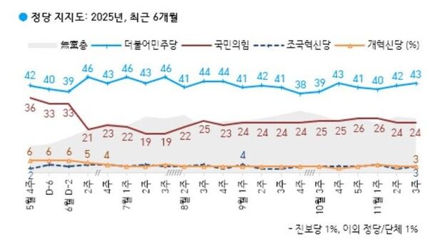 이어 조국혁신당·개혁신당은 각 3%, 진보당은 1%를 기록했다. 이외 정당·단체는 1%, 지지하는 정당이 없는 무당층은 26%다.
