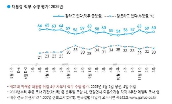 이재명 대통령의 직무 수행에 대해 '잘하고 있다'는 긍정 평가는 60%, '잘못하고 있다'는 부정 평가가 30%라는 여론조사 결과가 21일 나왔다.