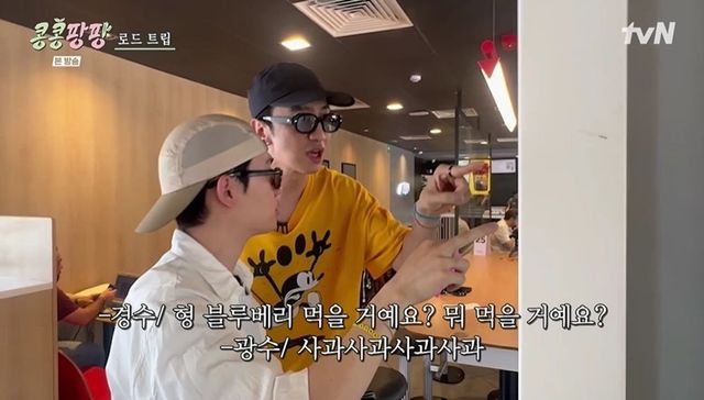 김우빈이 잠시 소지품을 맡기고 자리를 비운 사이 이광수와 도경수는 홀린 듯 신메뉴를 보게 됐다. 이광수는 “이거 멕시코에만 있다. 지금 안 먹으면 영원히 못 먹어”라고 했고, 도경수는 “우빈이 형 없으니까”라면서 감사인 김우빈의 카드를 꺼냈다. 급기야 이광수는 애플파이까지 주문하려 했다.