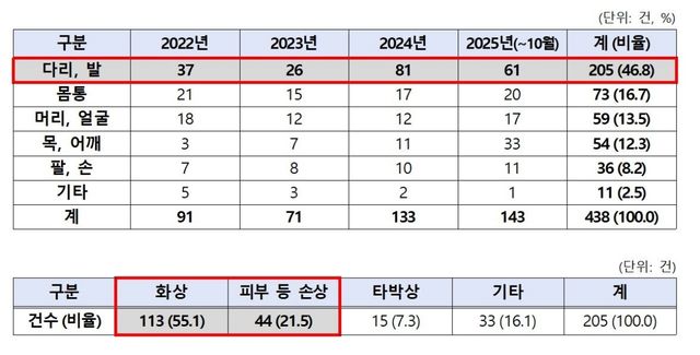 실제 위해사고 신고도 꾸준히 늘고 있다. 소비자원 위해감시시스템(CISS)에 접수된 다리·발 마사지기 화상 사고는 2023년 26건에서 지난해 81건으로 급증했고 올해 1∼10월에도 이미 61건이 보고됐다. 최근 3년간 발생한 관련 사고는 총 205건이며 이 중 76% 이상이 화상이나 피부 손상 사례였다.