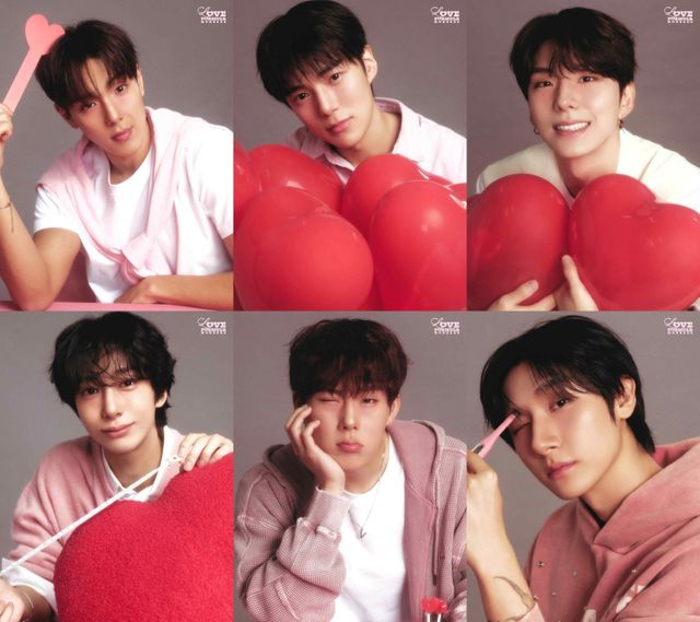 또 다른 버전의 콘셉트 포토에서는 핑크톤의 댄디한 스타일링으로 등장했다. 하트 오브제를 끌어안거나 크기를 재는 등 다양한 포즈로 재미를 더했고, 6인 6색의 사랑스러운 비주얼을 과시하며 로맨틱 무드를 전했다.