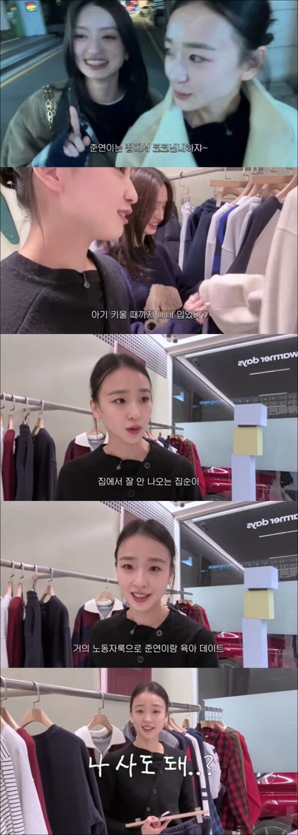 이어 남색 트레이닝복 셋업을 본 손연재는 "둘째 낳고 조리원 갈 때 사야겠다"고 말했고, 기예지가 "내가 사줄게"라고 나서며 새 육아 룩 구매가 성사됐다. 손연재는 예쁜 외출복 대신 "난 집에 있는 시간이 많다. 집 밖으로 나오긴 하는데 거의 노동자 차림으로 준연이를 데리고 온다"며 실용성을 강조하며 결국 셋업을 구매했다.