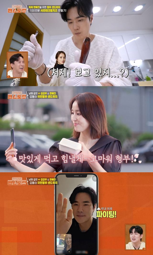 21일 방송된 KBS 2TV ‘신상출시 편스토랑’(이하 ‘편스토랑’/연출 윤병일)에서는 순정셰프 김강우가 막내 처제 한혜진을 위해 역대급 조공에 나섰다. 한혜진의 드라마 촬영장에 커피차와 함께 직접 싼 샌드위치 100개를 선물한 것. 김강우가 왜 국민남편에 이어 국민형부로 불리는지 알 수 있는 시간이었다.