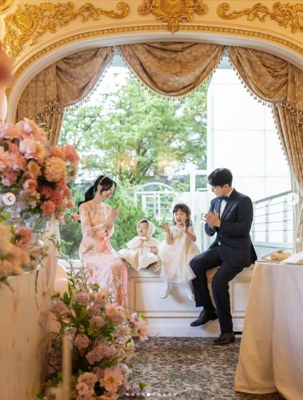 공개된 가족사진 속 이정현은 연한 핑크색 원피스를 우아하게 소화했으며, 남편 박유정 씨는 깔끔한 턱시도 차림으로 함께했다. 부부는 두 딸을 품에 안고 포즈를 취했으며, 화려하면서도 따뜻한 배경 속에서 부모를 쏙 빼닮은 사랑스러운 두 딸의 모습이 더해져 그림 같은 분위기를 연출했다.