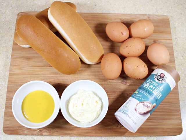 재료는 핫도그빵, 계란, 마요네즈, 허니머스타드 준비했어요.