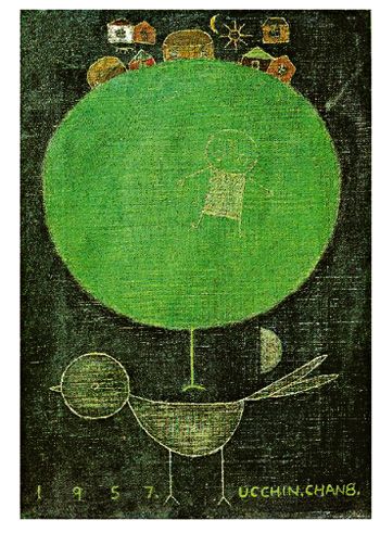‘나무와 새’는 해와 달이 처음 등장한 작품이다. 해와 달은 자그마하게 그려졌으며, 커다란 나무가 캔버스를 꽉채우고 있다. 유년 시절 추억을 떠올리게 하는 작품이다. <출처: 국립현대미술관>출처:>