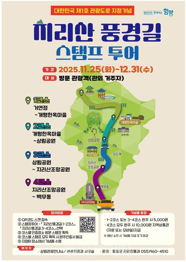 [투어코리아=이주현 기자] 함양군은 대한민국 제1호 관광도로로 지정된 ‘지리산 풍경길’을 보다 쉽게 즐길 수 있도록, ‘지리산 풍경길 스탬프 투어’를 오늘(25일부터) 12월 31일까지운영한다.