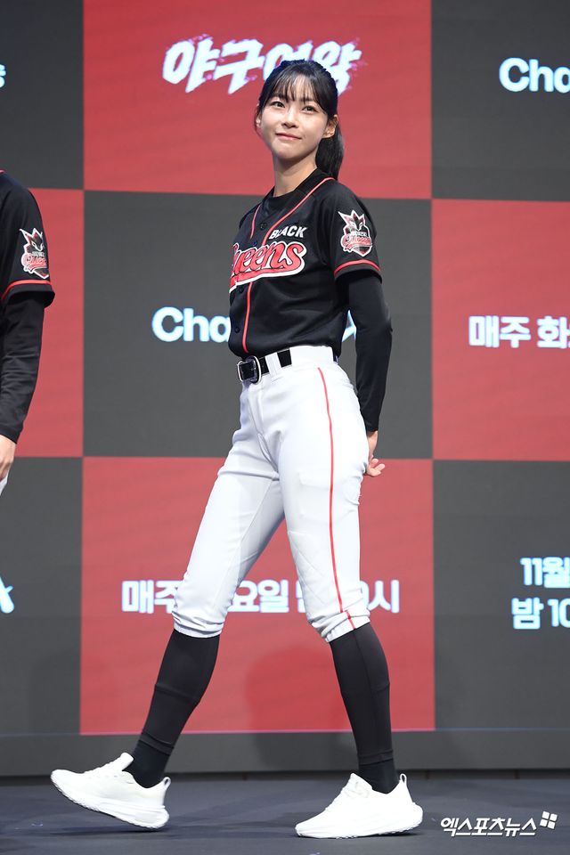 이날 김민지는 팀 '블랙퀸즈'의 블랙 상의와 화이트 팬츠의 클래식한 조합에 날카로운 레드 라인 포인트를 더한 ‘유니폼의 정석’이라 불릴 만큼 완성도 높은 야구선수 그 자체의 모습으로 프로그램에 임하는 자세와 에너지를 그대로 드러냈다.