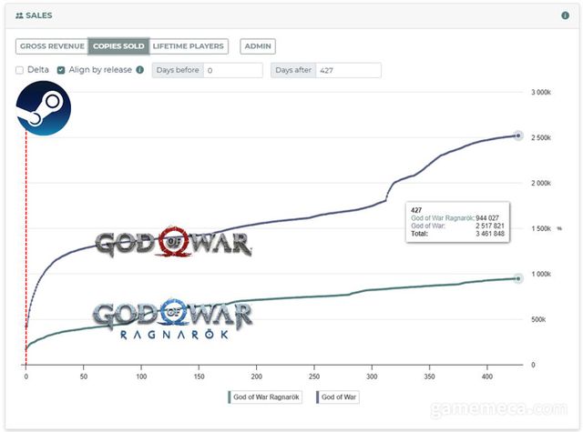 ▲ 갓 오브 워와 갓 오브 워 라그나로크 스팀 판매량 비교 (자료출처: 알리네아 애널리틱스 공식 홈페이지)
