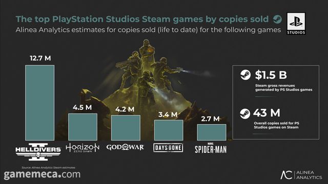 게임 시장분석 업체 알리네아 애널리틱스(Alinea Analytics)는 지난 21일(현지 기준) 스팀에 출시된 PS5 게임 총매출을 포함한 주요 성과에 대해 조사한 결과를 밝혔다. 이번 조사는 플레이스테이션 스튜디오가 스팀에 출시한 게임에 관련된 것이며, 시장조사 업체에서 자체적으로 추산한 결과다.