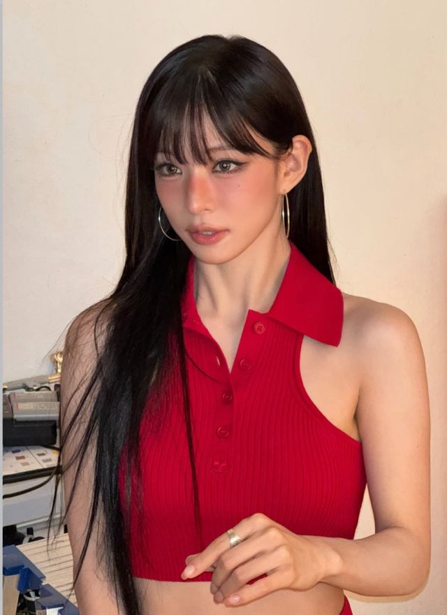 또, 리브드 소재의 타이트한 핏으로 슬림한 체형을 더욱 강조했고, 와이드 카라 디테일이 세련된 무드를 더했다. 정면 사진에서는 깊게 잡힌 아이라인과 은은한 블러셔가 어우러져 한층 우아한 매력을 완성했다.