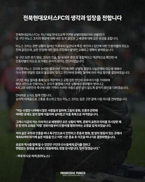뉴시스 보도에 따르면, 타노스 코치는 25일 전북 구단을 통해 "저는 수많은 나라에서 많은 사람과 일하며 그들의 문화 인종과 관련해 어떠한 문제도 없이 함께 어울리며 살아왔고 이를 축복으로 여겨왔다"며 "그러나 지금의 저는 지속적으로 해명했던 모든 상황의 맥락, 문화적 표현과 의미를 무시당한 채 단 한 번의 오해로 '자칭' 권위자들로부터 인종차별 행위자라는 오명을 입게 됐다"고 전했다.