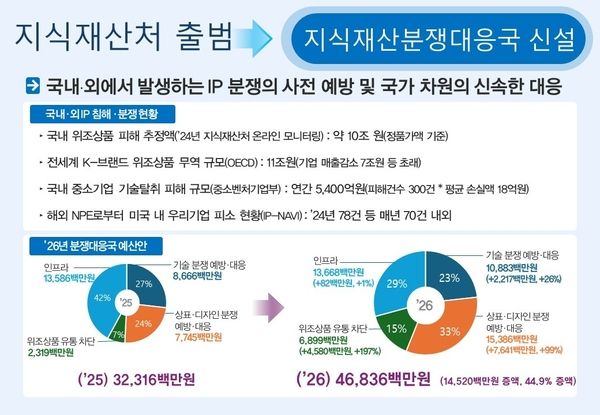지식재산처는 지식재산 분쟁 예방·대응 강화를 위해 지식재산분쟁대응국을 신설하고, 2026년도 예산을 전년 대비 145억 원 증액한 468억 원으로 편성했다고 25일 밝혔다.