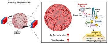 고려대학교 의과대학 의공학교실 박용두 교수와 고려대 대사증후군연구소 임도선 교수팀은 자성 나노입자를 심장 오가노이드에 적용해 미세한 회전 자극을 가하는 새로운 방식의 기계적 자극 플랫폼을 구축했다.