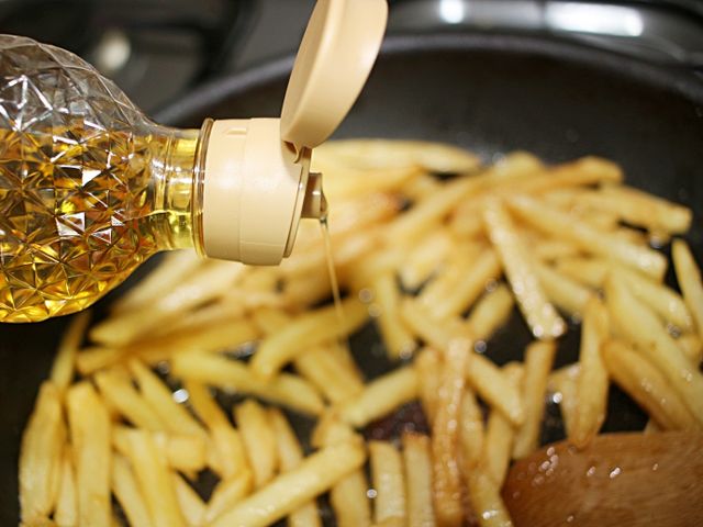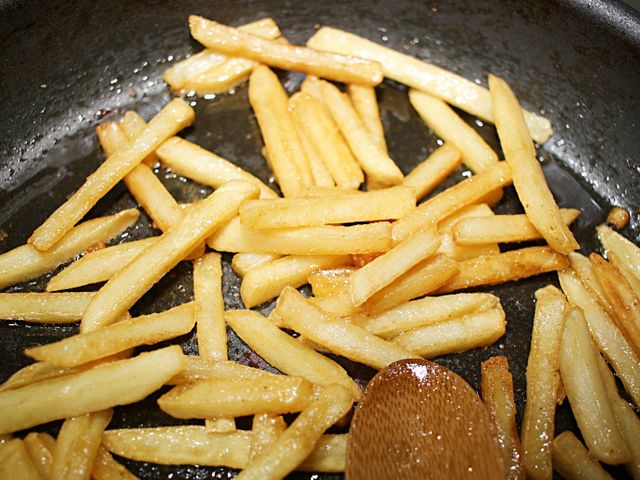 감자튀김이 갈색으로 변할 때쯤 올리고당을 넣어요.