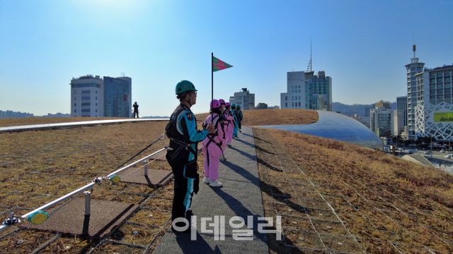 출발 지점은 뮤지엄 4층 둘레길 라운지다. 참가자들은 체크인 후 간단한 안전교육을 받는다. 헬멧을 머리에 맞춰 조이고 팔찌형 안전장비를 손목에 채우는 순간, 이 산책이 일반적인 전망대 체험과 다르다는 사실이 분명해진다. 루프톱은 최대 30m 높이에서 곡선 구조로 이어져 있어 모든 참가자는 난간 라인에 장비를 연결한 채 이동해야 한다. 프로그램은 오전 11시와 오후 1시 30분(영어), 오후 3시 30분 총 세 차례 운영한다.