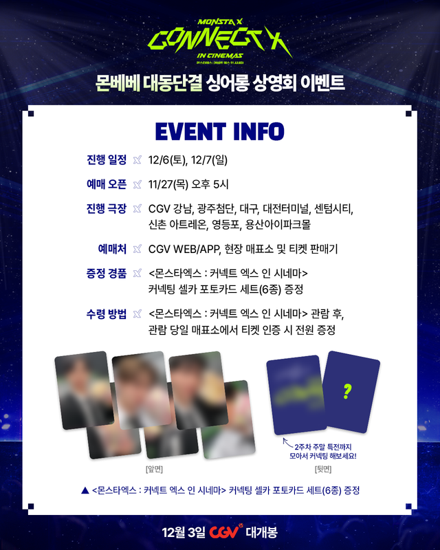 전 세계 50여 개국 개봉을 확정한 영화 ‘몬스타엑스 : 커넥트 엑스 인 시네마’는 SCREENX, 4DX, ULTRA 4DX까지 다채로운 포맷으로 12월 3일부터 오직 CGV에서만 만날 수 있다.