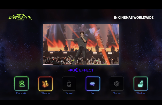 함께 공개된 4DX 예고편은 몬스타엑스 공연의 앙코르 무대를 장식하는 몬베베들의 애창곡 ‘Rodeo’의 무대를 담아냈다. 얼굴 앞쪽으로 분사되는 바람 효과인 페이스 에어, 순간적인 섬광이 보이는 효과인 스트롭, 꽃향기가 나는 센트 효과와 바람 효과인 팬, 특수 용액을 사용해 눈을 날리는 효과인 스노우, 그리고 모션 체어의 등받이와 쿠션에서 섬세한 진동을 느낄 수 있는 쉐이커까지. 총 여섯 개의 4DX 효과는 무대를 더욱 생동감 넘치게 즐길 수 있도록 돕는다. 특히, 멤버들이 무대에서 에어건을 발사할 때 느껴지는 페이스 에어 효과나 무대에서 뛸 때 함께 진동하는 쉐이커 효과 등 퍼포먼스와 밀접하게 연계된 효과들은 현장감을 생생하게 살렸다. 관객이 마치 공연장 한가운데에 있는 듯한 기분을 선사할 것으로 기대된다.