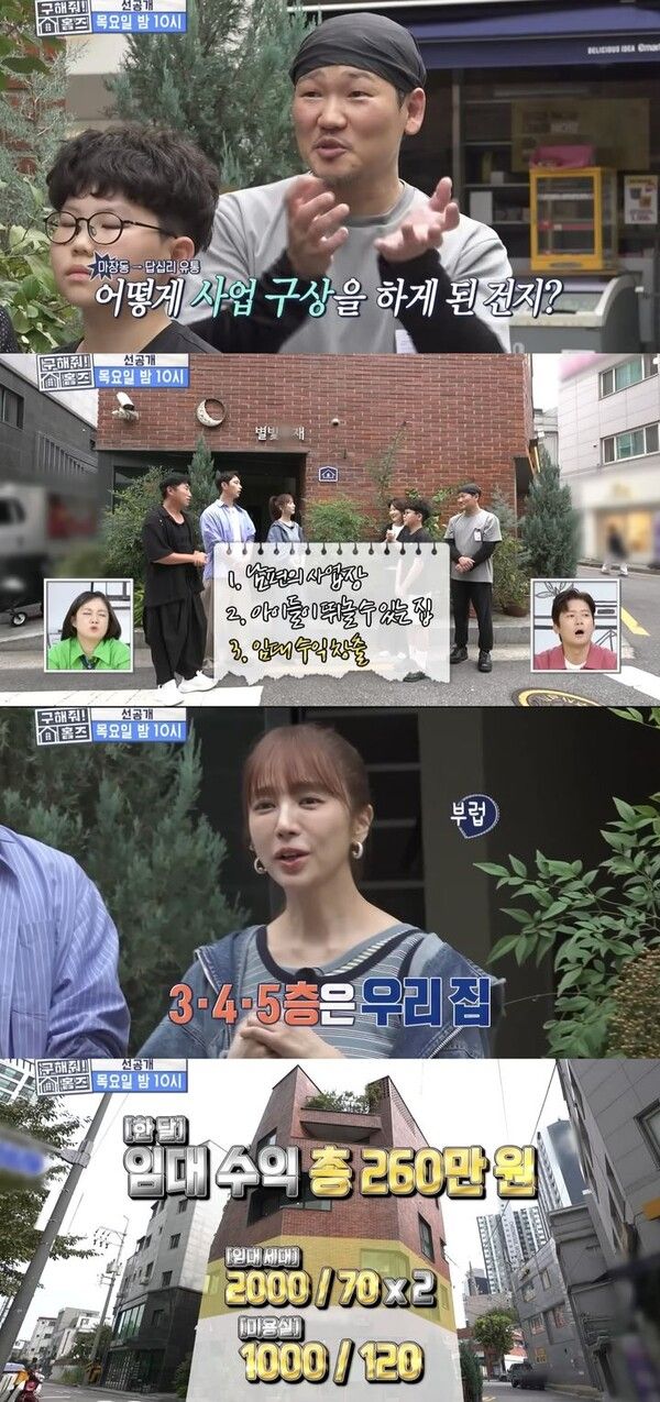 그는 "1층은 남편 사무실이랑 미용실이 있고 2층은 임대 세대가 있다. 3~5층을 저희 집으로 쓰고 있다. 월 임대 수익이 260만원"이라고 말한다.