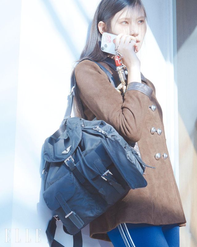 리넨 드레스와 타이츠, 레더 펌프스, 파우치가 달린 미디엄 리나일론 백팩, 갤러리아 스몰 사피아노 백은 모두 Prada.