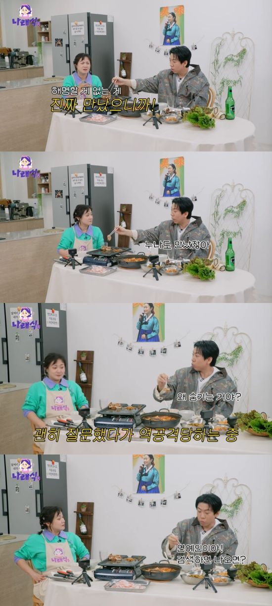 박나래가 "나? 걔 연예인 아니야"라며 손사래를 치자, 양세찬은 "아이 왜 이래. 정말 박사장님! 자기 얘기는 숨기는 거야? 연예인이다. 내가 검색해서 찾아서 나오면"이라고 목소리를 높였다.